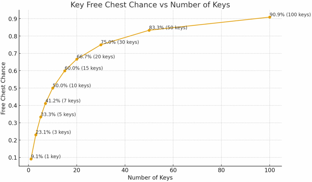 if n = number of keys, then this formula can be used to describe the chance of getting a free chests from X amount of keys
