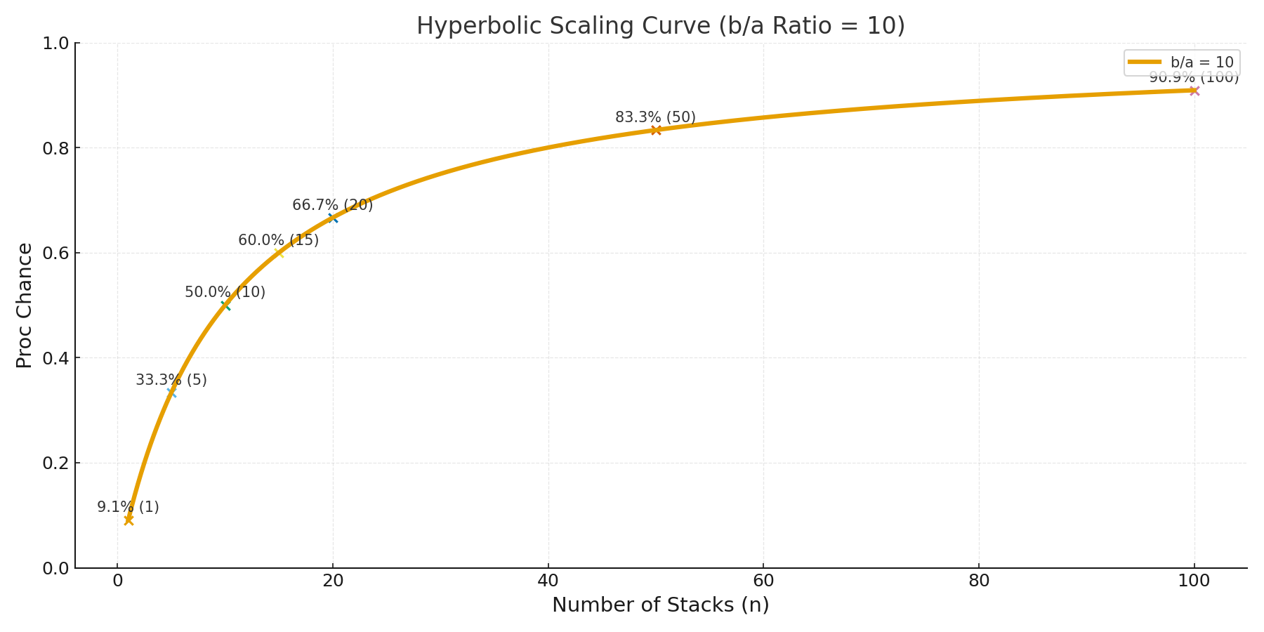 For every item that uses hyperbolic scaling, the in-game description ends up being slightly misleading. For instance, having 1 Key does not give you a 10% chance to open a chest, but only ~9.09% (rounded up to 9.1% in the image above). This is because the game displays the raw per-stack value (like “+10%”) before feeding the combined value into the hyperbolic scaling function. The real chance is calculated afterward.